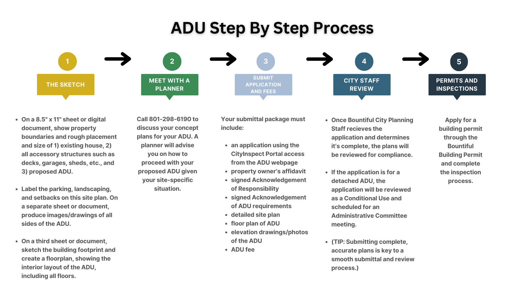 Bountiful City allows ADUs, both internal and external units subject to meeting code requirements. Detached ADUs are considered a conditional use and require Bountiful City Administrative Committee approval. Internal ADUs are reviewed and approved by City Staff.